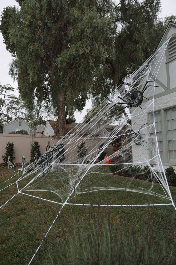 Add a few extra-large spiders crawling across the strands, and it looks like your house is under siege. You can make the web using thick rope or white clothesline, then layer in fake webbing for a realistic touch.
