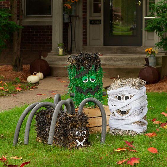 Your front yard will instantly feel like a playful Halloween scene with these quirky straw monsters. A Frankenstein made from a hay bale painted green, with messy âhairâ and sleepy eyes, sets a funny yet spooky tone.