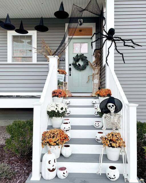 Beside it, a black jack-o -lantern pot filled with vibrant fall flowers softens the look, bringing a pop of color and a touch of charm. The combination makes your porch both eerie and inviting at the same time.