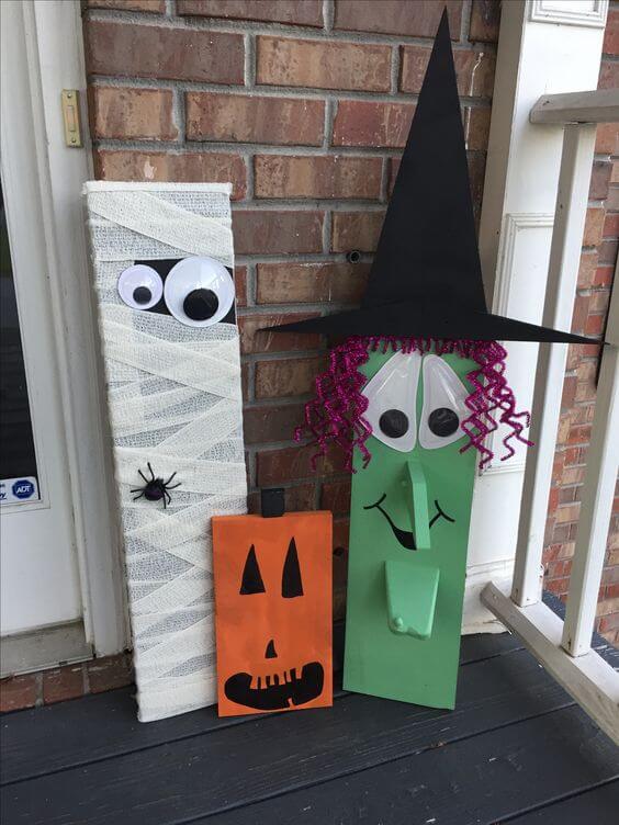 These playful wooden characters bring a mix of charm and spookiness to your Halloween porch setup. With just a few planks of wood, some paint, and craft supplies, you can create a mummy, a pumpkin, and a witch that greet guests with personality.