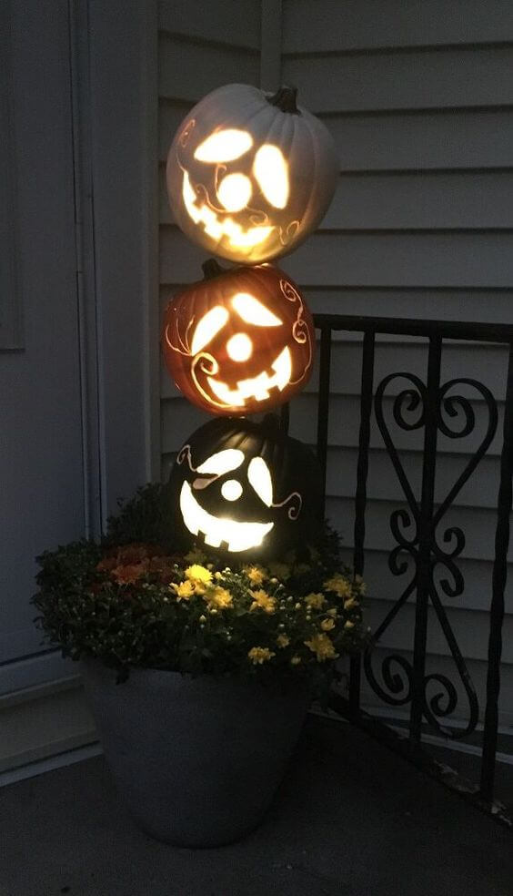 Three carved pumpkins painted white, orange, and black are stacked vertically in a planter filled with fall flowers. Each pumpkin has a whimsical carved face, and when lit from inside, it casts a warm, spooky glow that looks fantastic at night.
