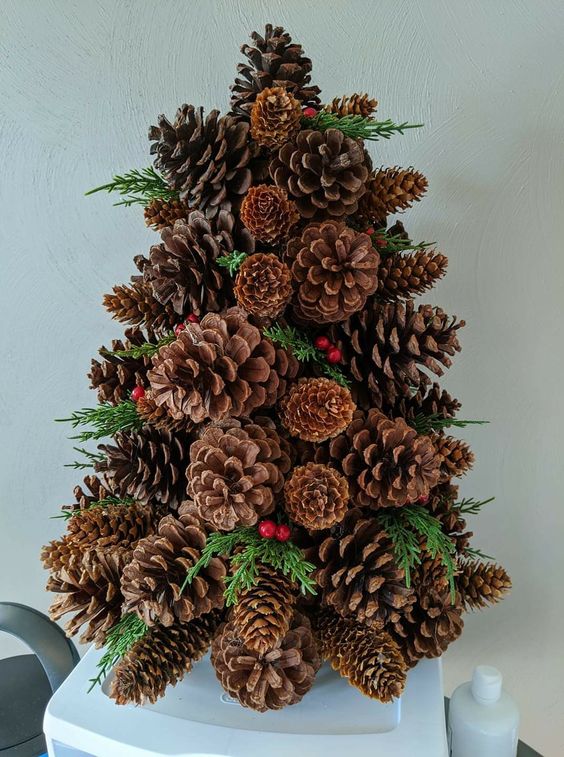 Step 2: Once the tree is fully covered, tuck in greenery and berries between cones for a festive look. Use floral wire for extra hold if needed.