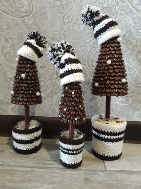 These pinecone Christmas trees wearing cozy crochet hats are the perfect blend of rustic and whimsical.