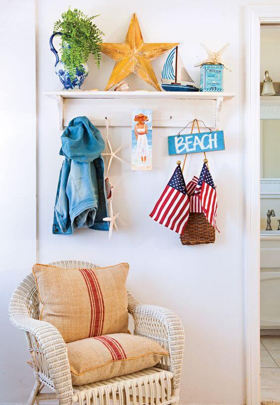 To recreate this look, start with a simple shelf and add nautical décor like boats, shells, or lanterns. Use hooks underneath for practical storage, hanging jackets, hats, or beach bags.
