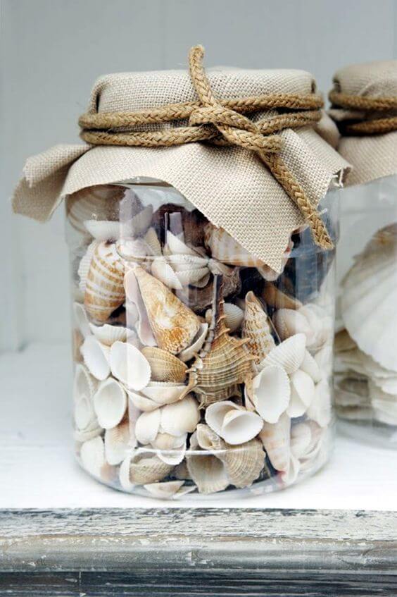 To create your own, gather seashells of different shapes and sizes, then place them inside a clean glass jar. Cover the lid with a piece of burlap or linen and tie it with twine or rope for a coastal finish.