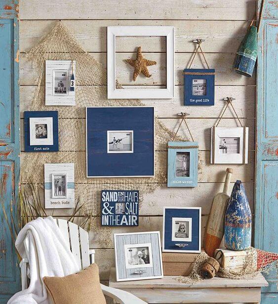 This gallery wall is a beautiful way to bring the ocean indoors while showcasing personal memories. The mix of blue and white frames, nautical props, and a textured fishing net backdrop instantly sets a seaside tone.
