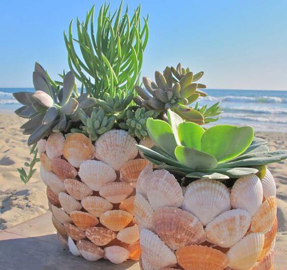 To make one, gather shells of similar size and glue them around the outside of your pot in layers. Choose a strong adhesive so the shells stay secure over time.