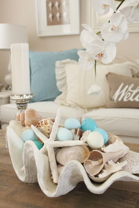 This charming display uses a giant clam shell as a base, filled with starfish, seashells, and aqua-toned decorative balls. It s a stunning mix of natural textures and soft coastal colors, bringing a breezy beach vibe right into your living room.
