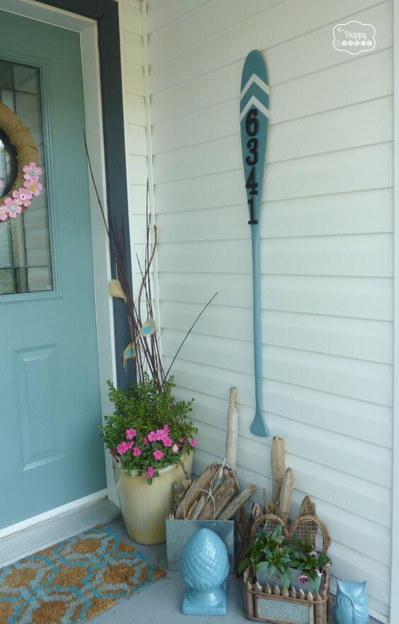 This idea turns a simple oar into a creative way to display your house number. Painted in a fresh coastal blue with bold black numbers, it instantly adds charm and personality to the front porch.