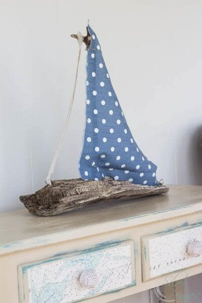 To make your own, collect a sturdy piece of driftwood and attach a small stick as the mast. Cut fabric into a sail shape and secure it with hot glue or string.