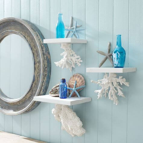 To recreate this look, use small floating shelves and decorate them with beach finds. Secure faux coral or driftwood underneath for extra detail.