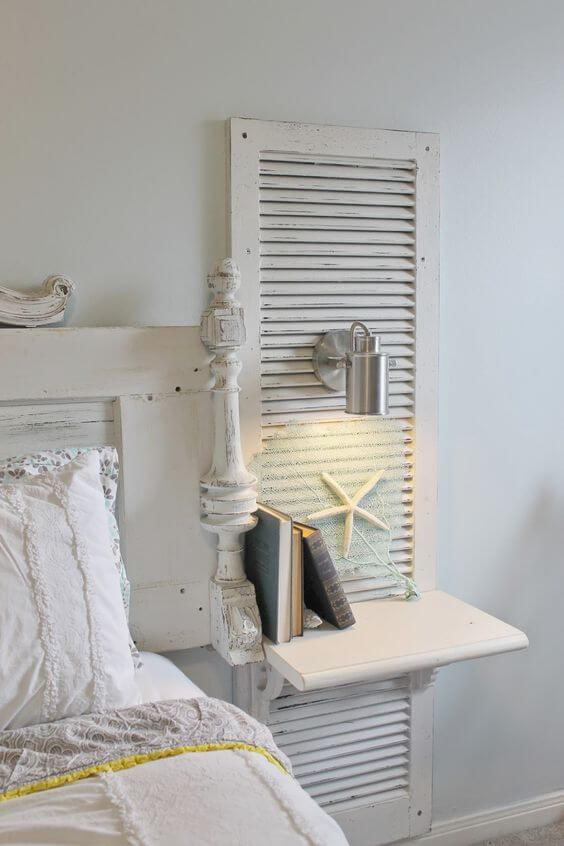 You can recreate this look by repurposing old shutters or wooden panels as a backdrop. Add a mounted light, a small shelf for books, and a coastal touch like a shell or starfish.