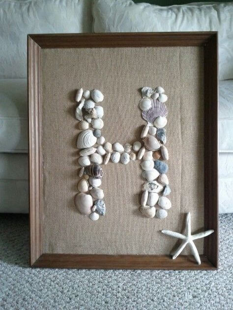 This framed seashell art is such a charming way to repurpose shells you ve collected on past beach trips. The letter âHâ formed with assorted shells gives it a personal touch, while the burlap background adds a rustic coastal texture.