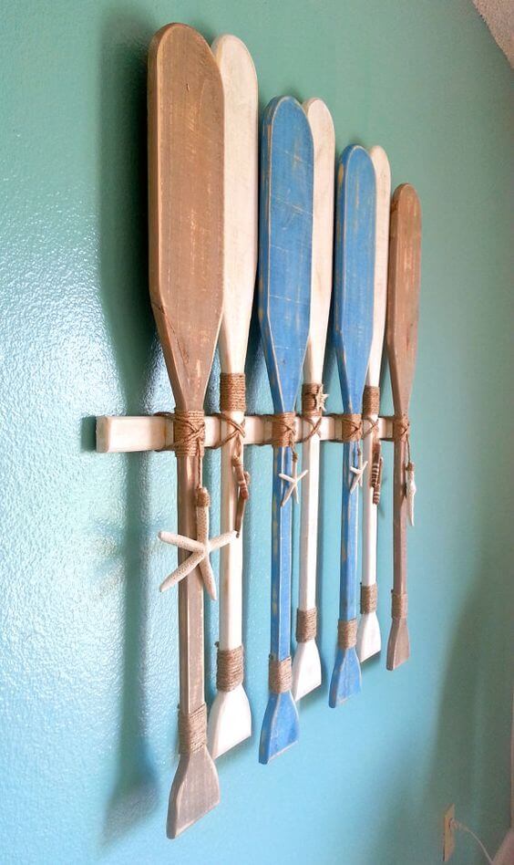 To make this look, sand and paint old oars, then secure them onto a wooden support with jute rope. Add small nautical trinkets for extra charm. It s a simple project that creates a striking focal point on any wall.
