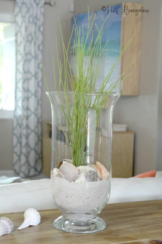To recreate this, start with a clear vase and add a layer of fine sand at the bottom. Tuck in a few seashells, coral pieces, or driftwood for variety, then place faux or real coastal grass in the center.