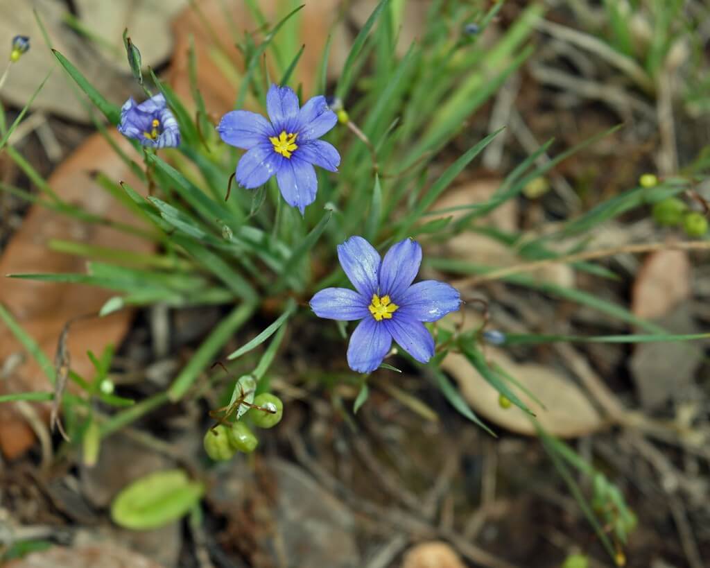 Stiff Blue-Eyed Grass is not a true grass but a perennial with grassy leaves and tiny blue flowers. It does well in full sun and moist soil. Plant in clumps along walkways or in rock gardens.