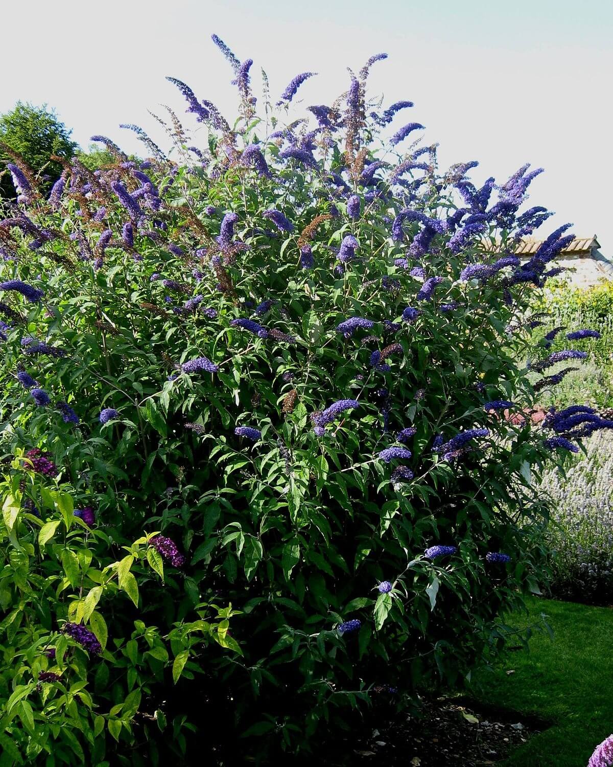 Empire Blue Butterfly Bush produces fragrant, cone-shaped clusters of deep blue flowers. It thrives in full sun and well-drained soil. Plant in spring and water regularly until established, then reduce watering.