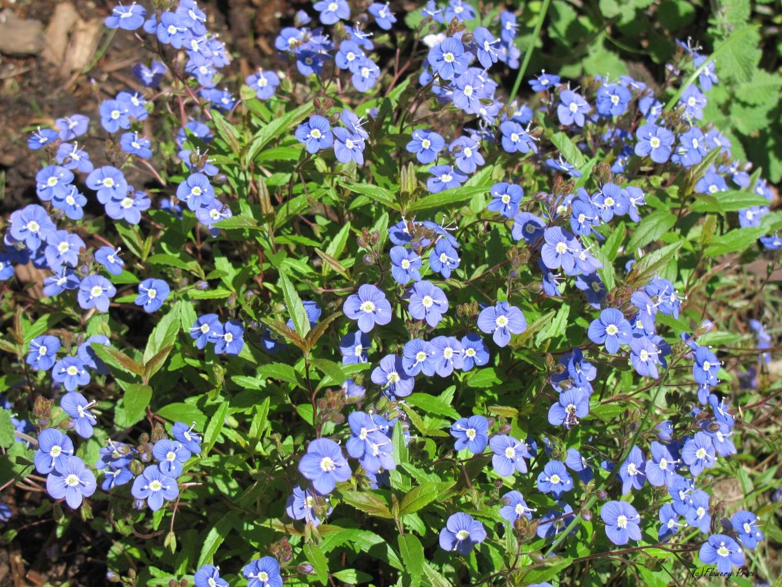 Veronica Georgia Blue produces a sea of tiny, bright blue flowers with white centers. It blooms profusely in spring and can handle both sun and partial shade. Plant in well-draining soil and water moderately to keep it lush.