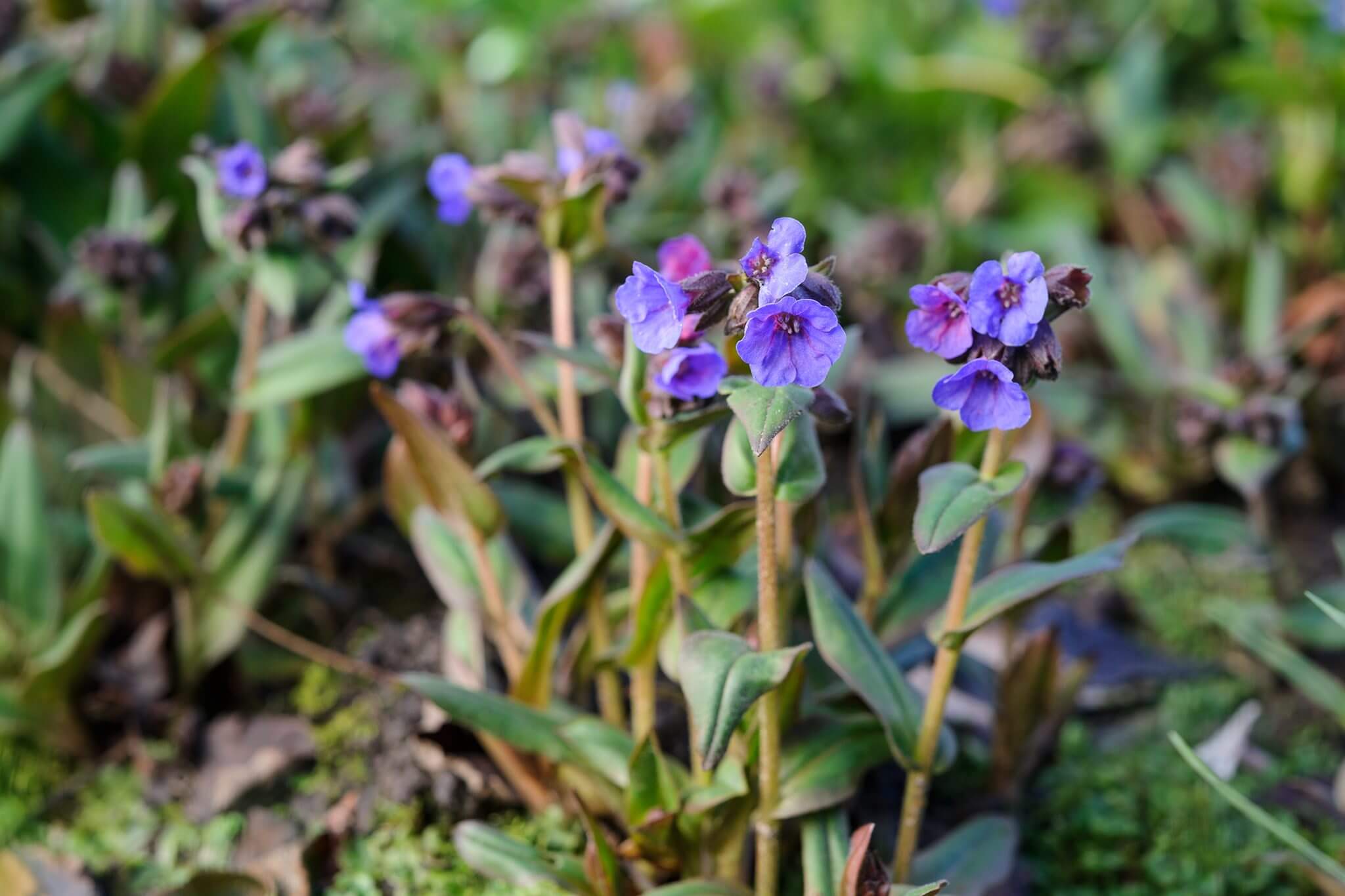 Lungwort starts with pink buds that open into charming baby blue flowers, creating a two-toned effect. Its speckled green leaves remain attractive even after blooming. Plant it in shady areas with moist, rich soil for the best performance.