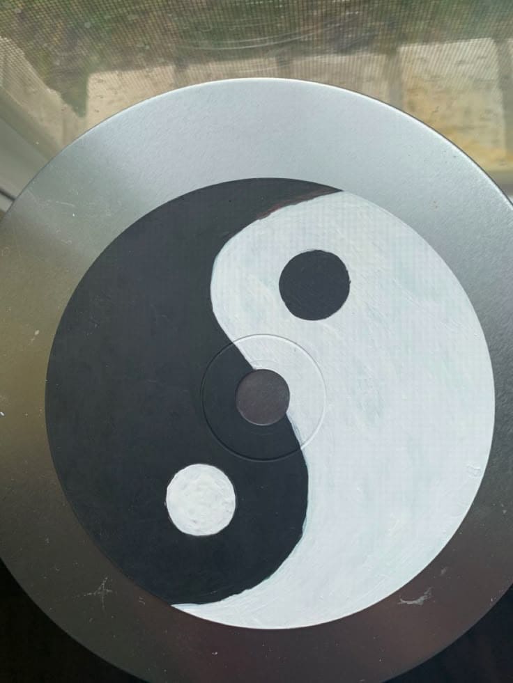 The combination of black and white in this Yin Yang vinyl record painting creates a visually striking and thought-provoking piece of art.