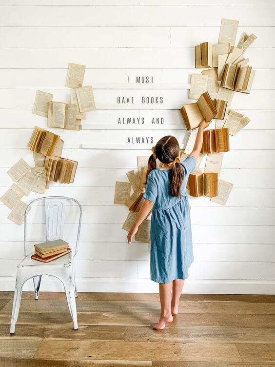 Each page tells a different tale, and together they create a warm, moody ambiance that makes the entire room feel like a vintage library corner.