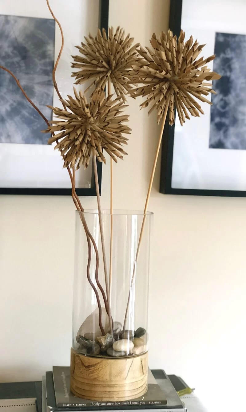 Step 4: Arrange 2â3 completed flowers inside your vase. Mix in curly willow branches or twigs for movement and anchor everything with decorative stones or pebbles.
