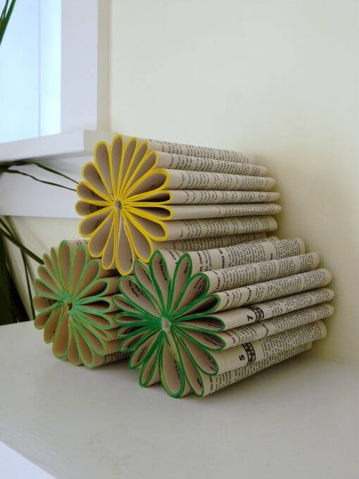 Step 1: Tear out the book pages and cut them into quarters (around 2.5″ x 4″). Roll each piece into a tight cone with a pointed end, sealing with a dot of glue. Repeat until you have at least 100â120 paper cones per flower.