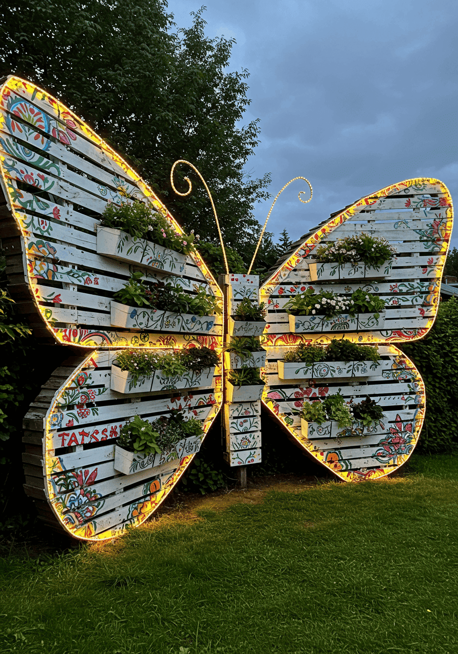 I have never seen anything as enchanting as this butterfly pallet garden display. The white-painted pallets are shaped into a butterfly, outlined with glowing lights, and adorned with colorful floral patterns.