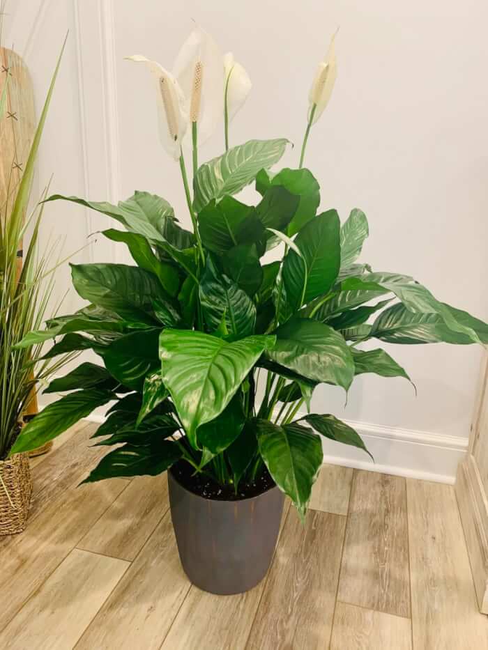 Peace Lily is loved for its graceful white blooms and glossy green leaves. It thrives in medium light and moist soil. Mist the leaves occasionally to boost humidity.