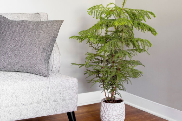 This soft-needled pine looks like a miniature Christmas tree year-round. Give it bright light and keep the soil evenly moist, especially in summer.